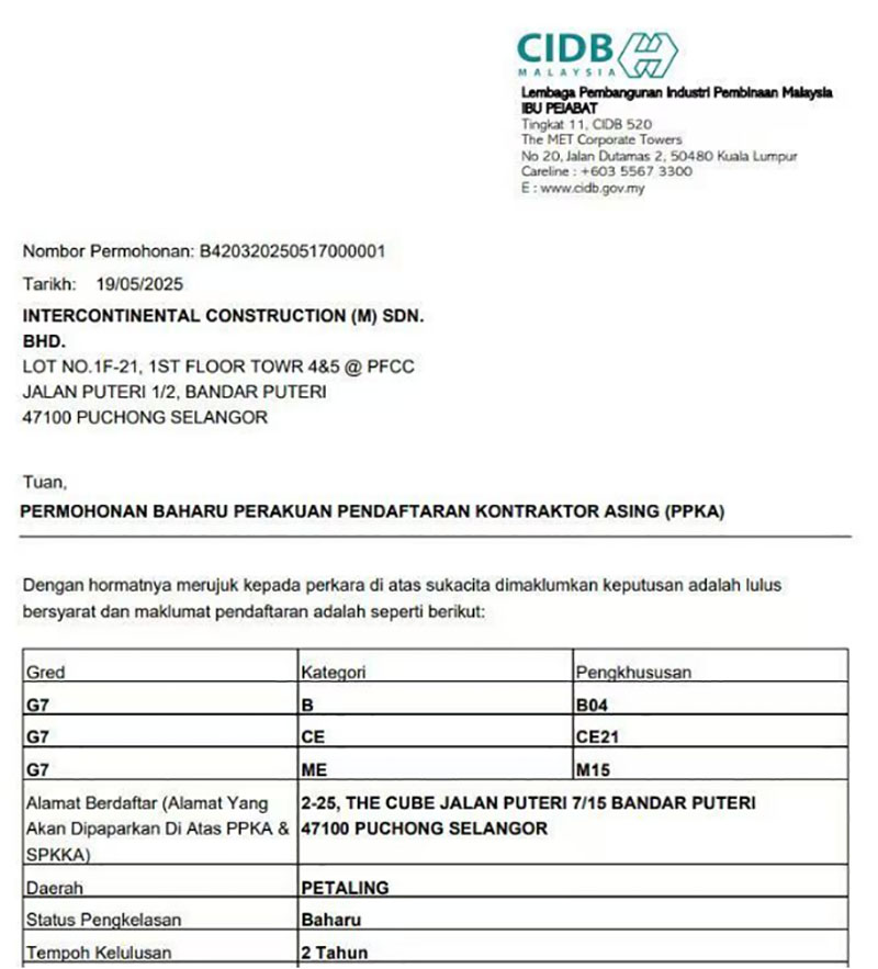 近日,經(jīng)馬來西亞建筑工業(yè)發(fā)展局(CIDB)批準,合景建設(shè)集團有限公司全資子公司洲際建設(shè)(馬來西亞)有限公司取得馬來西亞最高等級G7承包商資質(zhì),包括土木工程(CE21)、土建工程(B04)、機電工程(M15)以及各種機械工程等多項內(nèi)容。這是合景建設(shè)在馬來西亞建筑資質(zhì)領(lǐng)域的重大突破,意味著公司在智慧建筑領(lǐng)域的技術(shù)實力、屬地化服務(wù)能力及行業(yè)影響力獲官方權(quán)威認可。