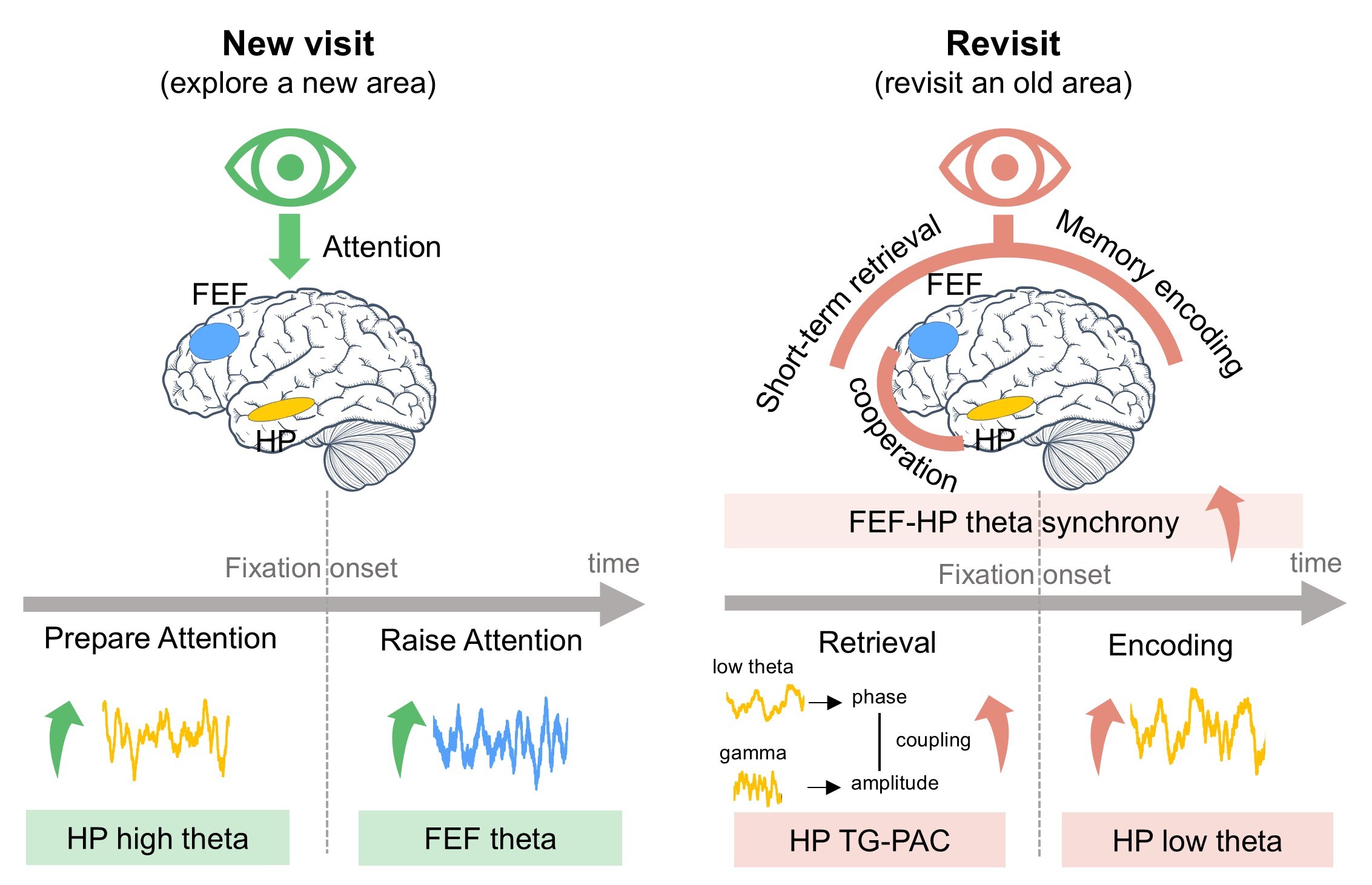 顱內(nèi)腦電圖(iEEG)技術(shù)可直接記錄大腦深部的神經(jīng)電活動(dòng),這是目前人類能夠獲取的最高時(shí)空精度的神經(jīng)信號(hào)之一。高精度眼動(dòng)追蹤(Eye tracking)可以實(shí)時(shí)捕捉患者每一瞬間在看什么、怎么看。研究團(tuán)隊(duì)將兩項(xiàng)技術(shù)同步結(jié)合,首次在單次注視水平上解析了海馬體與額葉眼動(dòng)區(qū)的動(dòng)態(tài)協(xié)同機(jī)制。結(jié)果顯示:當(dāng)探索新信息時(shí),海馬體在注視前數(shù)百毫秒即提前激活,進(jìn)入“預(yù)備注意”狀態(tài),額葉眼動(dòng)區(qū)則在注視后迅速響應(yīng)以維持關(guān)注;當(dāng)回訪熟悉內(nèi)容時(shí),海馬體自動(dòng)切換至“記憶提取”模式,引導(dǎo)眼睛精準(zhǔn)回看,隨后進(jìn)入“記憶鞏固”狀態(tài)。整個(gè)過程伴隨兩個(gè)腦區(qū)間的實(shí)時(shí)協(xié)同通信。
